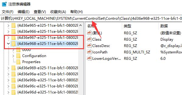 3、路径:计算机\HKEY_LOCAL_MACHINE\SYSTEM\CurrentControlSet\Control\Class\{4d36e968-e325-11ce-bfc1-08002be10318}