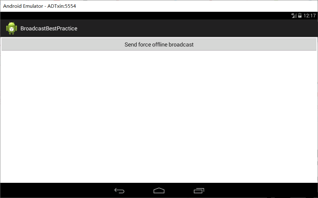 <LinearLayout xmlns:android="http://schemas.android.com/apk/res/android" xmlns:tools="http://schemas.android.com/tools" android:layout_width="match_parent" android:layout_height="match_parent" > <Button android:id="@+id/force_offline" android:layout_width="match_parent" android:layout_height="wrap_content" android:text="Send force offline broadcast" /> </LinearLayout>