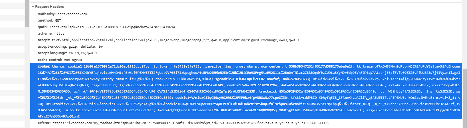 1.先手动登录自己的淘宝账号,从中提取出cookie,如下图中所示。