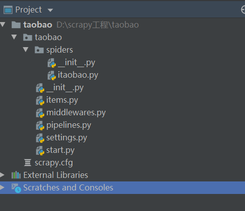 3.pycharm打开项目目录 ,在terminal中输入(scrapy genspider itaobao taobao.com),得到如下的目录结构