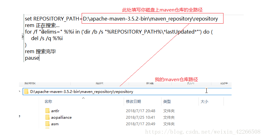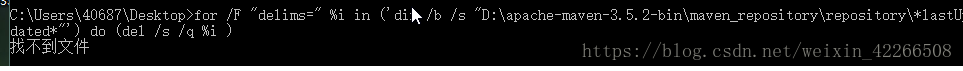 set REPOSITORY_PATH=你的maven仓库全路径 rem 正在搜索... for /f "delims=" %%i in ('dir /b /s "%REPOSITORY_PATH%\*lastUpdated*"') do ( del /s /q %%i ) rem 搜索完毕 pause