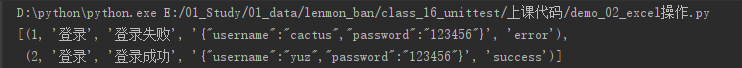通过运行上述代码,我们将存储的测试数据逐条取出,每一条数据存放在一个元组当中,所有的元组组成一个列表,运行结果如下: