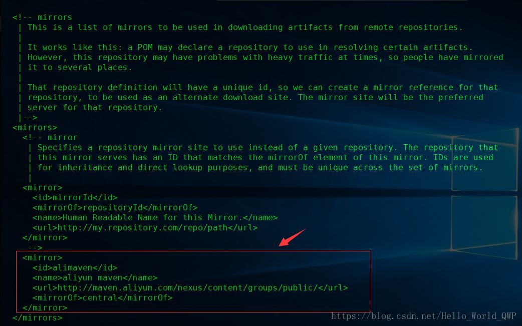 编辑该配置文件,找到 <mirror></mirror> 节点,例如,使用 阿里的maven 镜像地址,则在该节点下输入如下内容: