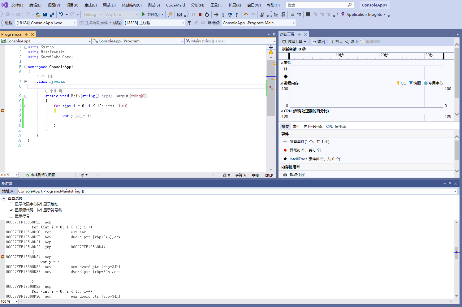 若要在调试期间打开反汇编窗口,请选择窗口>反汇编或按 Alt+8 。
