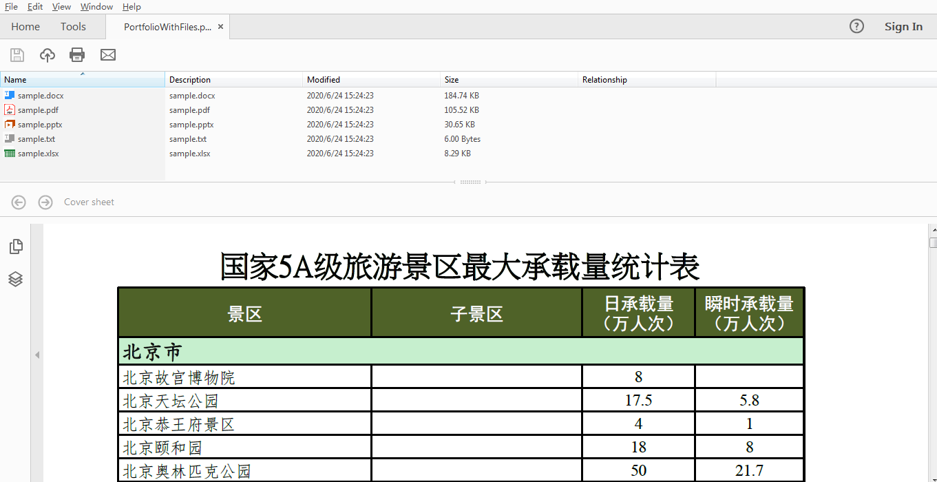 PDF文件包(Portfolio)允许用户将多种不同类型的文件如Word、Excel、PDF、PowerPoint和图片等集合到一个PDF文件中,用户可以打开、更改PDF文件包中的单个文件。添加文件包时,可支持创建文件包时并直接将文件添加到文件包;或者创建文件包的同时创建文件夹,并将文件添加到文件夹。