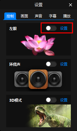首页 > 技术文章 > 正文 暴风影音如何关闭左眼 分类:技术文章   发布日期:2022-12-21 13:22:22 暴风影音左眼模式是一个非常好用的功能,会提升原片的画质,但是很多小伙伴就喜欢看原汁原味的电影,下面小编就给大家带来了关闭左眼模式的方法。 暴风影音如何关闭左眼 第一步:点击左下角设置 第二步:在控制下面点击小白点就可以开关了。 推荐阅读: python GUI库图形界面开发之PyQt5信号与槽的高级使用技巧(自定义信号与槽)详解与实例_python js实现点赞按钮功能的实例代码_javascript技巧 python GUI库图形界面开发之PyQt5信号与槽基础使用方法与实例_python SpringIOC refresh()初始化代码实例_java 关于Python字符串显示u...的解决方式_python Java实现邮件发送QQ邮箱带附件_java python GUI库图形界面开发之PyQt5动态(可拖动控件大小)布局控件QSplitter详细使用方法与实例_python Servlet中文乱码问题解决方案解析_java JAVA swing布局管理器实例解析_java SpringIOC DI循环依赖实例详解_java 浅谈python的elementtree模块处理中文注意事项_python python GUI库图形界面开发之PyQt5表单布局控件QFormLayout详细使用方法与实例_python C++计算24点的简单程序_C 语言 Python使用ElementTree美化XML格式的操作_python 微信小程序去除左上角返回键的实现方法_javascript技巧 热门内容: python包/库安装,解决ImportError: DLL load failed while importing _framework_bindings pytorch测试GPU是否可用和cudnn检测是否可用 Jupyter Notebook:FileNotFoundError: [WinError 2] 系统找不到指定的文件 excel怎么把重复项合并? excel将相同名字的数据合并在一起的教程_excel_办公软件_软件教程 windows怎么重启服务的命令? Windows服务启动与停止命令的教程_windows_Windows系列_操作系统 win11蜘蛛纸牌在哪 win11玩蜘蛛纸牌游戏的方法_windows11_Windows系列_操作系统 如何用ps调整贴图明暗色差的颜色? ps中调整色彩明暗度的的技巧_photoshop教程 win10开机10秒倒计时怎么取消? Win10取消开机倒计时的三种方法_windows10_Windows系列_操作系统 电脑C盘拒绝访问或打不开怎么办? win11/win10 C盘决绝访问的多种解决办法_windows11_Windows系列_操作系统 WPS如何并排比较两个文档 WPS并排比较两个文档的方法_金山WPS_办公软件_软件教程 WPS打印时如何添加装订线 WPS打印时添加装订线的方法_金山WPS_办公软件_软件教程 怎么关闭chrome/edge浏览器打开外部应用程序的弹窗 禁止广告弹窗的技巧_浏览下载_软件教程 WPS表格筛选后如何恢复原本的所有数据 Excel还原筛选的数据的方法_金山WPS_办公软件_软件教程 win10搜索不到指定内容怎么办? Win10搜索文件功能找不到文件的多种解决办法_windows10_Windows系列_操作系统 Win11更新失败资源管理器崩溃无限重启怎么解决?_windows11_Windows系列_操作系统 WPS饼图如何设置为分离性饼图 WPS饼图设置为分离性饼图的方法_金山WPS_办公软件_软件教程 wps表格无法拖动怎么回事? WPS Excel单元格无法拖拽移动的解决方法_金山WPS_办公软件_软件教程 WPS幻灯片中如何添加创意图形 WPS幻灯片中添加创意图形的方法_金山WPS_办公软件_软件教程 Win11系统保护在哪? Win11关闭Windows保护的技巧_windows11_Windows系列_操作系统 WPS表格如何设置四舍五入取整 WPS表格设置数字四舍五入取整方法_金山WPS_办公软件_软件教程