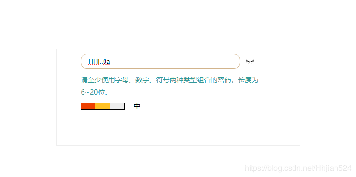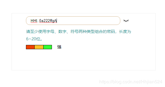 <div class="wrapper"> <div class="input_box"> <input type="password" name="" placeholder="请输入密码" oninput="passValidate(this)" id="inputPwd" value=""> <div class="eye_icon"></div> </div> <p>请至少使用字母、数字、符号两种类型组合的密码,长度为6~20位。</p> <ul class="pwdStrength"> <li class="weak"></li> <li class="middle"></li> <li class="strong"></li> <li class="result"></li> </ul> </div>