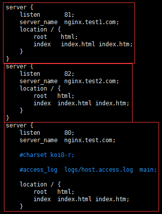 "#"代表注释,最重要的是server{}块这部分就代表每一个web站点,详细的配置介绍可以查阅我的另一片配置文章,此处我们先暂时设置三个站点