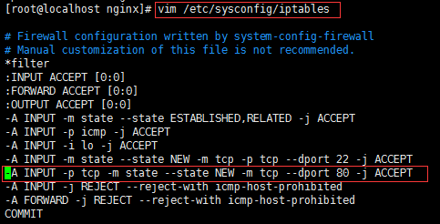 编辑防火墙白名单 [root@localhost ~]# vim /etc/sysconfig/iptables 增加下面一行代码 -A INPUT -p tcp -m state -- state NEW -m tcp --dport 80 -j ACCEPT 保存退出,重启防火墙 [root@localhost ~]# service iptables restart