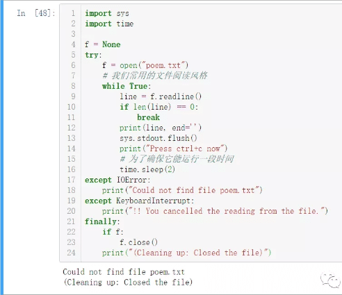 如果说,我想用python打开了一个txt文件,然后读取,写入,最后关闭文件对象。这是一套常规流程,如果我想捕捉代码过程中的异常,又要保证无论是否有异常,最后都必须要关闭文件。这时候就用到finally,看下面例子: