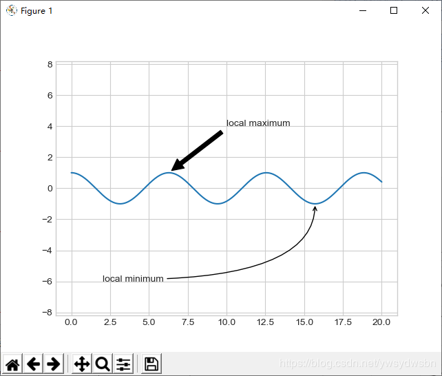 ax.annotate('local minimum', xy=(5 * np.pi, -1), xytext=(2, -6),arrowprops=dict(arrowstyle="->",