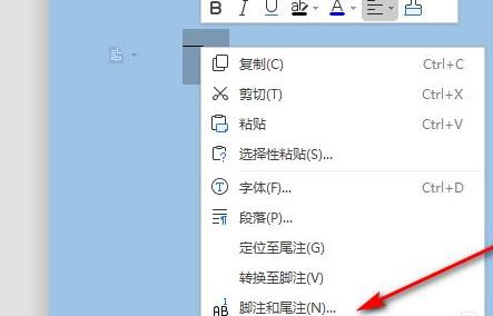 4、选中自己的尾注之后,右击选择“脚注和尾注”。