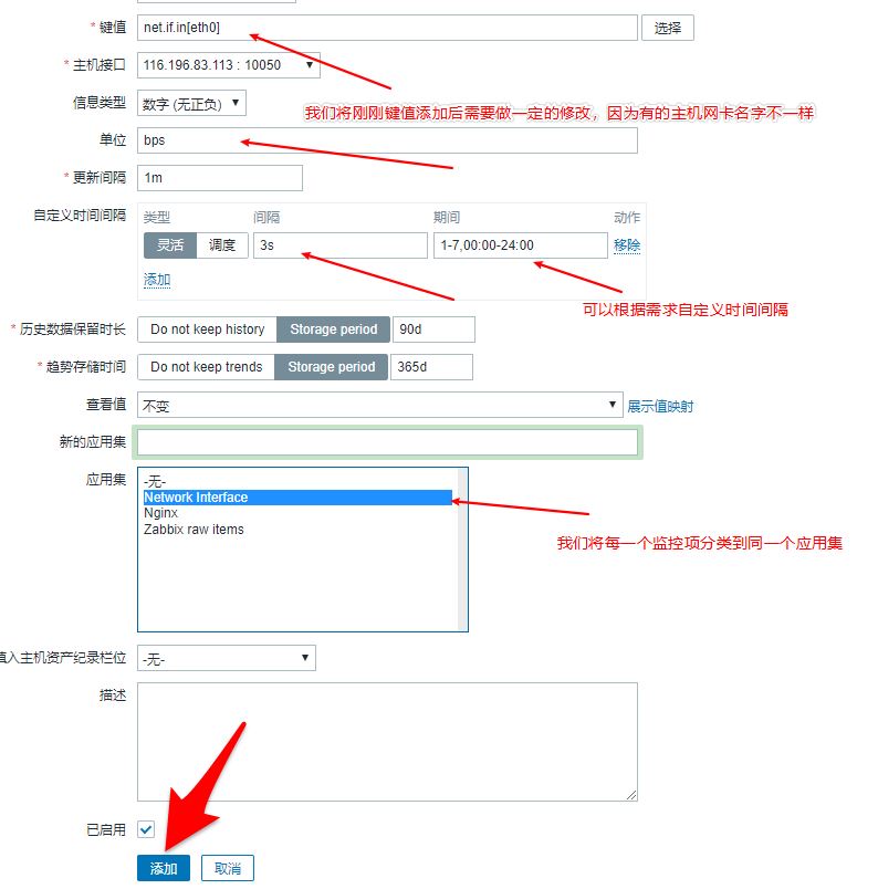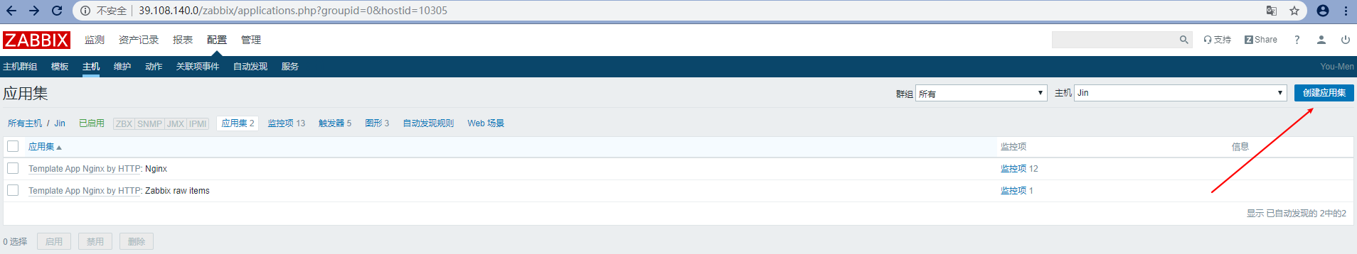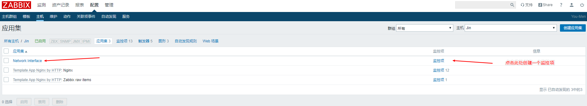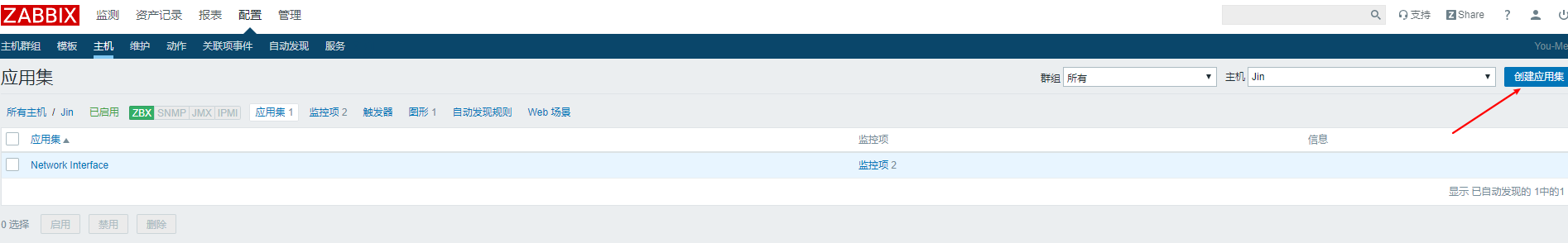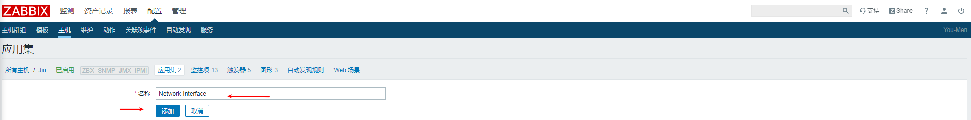 我们先创建一个应用集,这样的话之后创建的网卡上传,下载,总流量不会显的很乱,都在一个Network应用集里面,而且能导出成xml文件,放到其他的zabbxi主机上能直接用.
