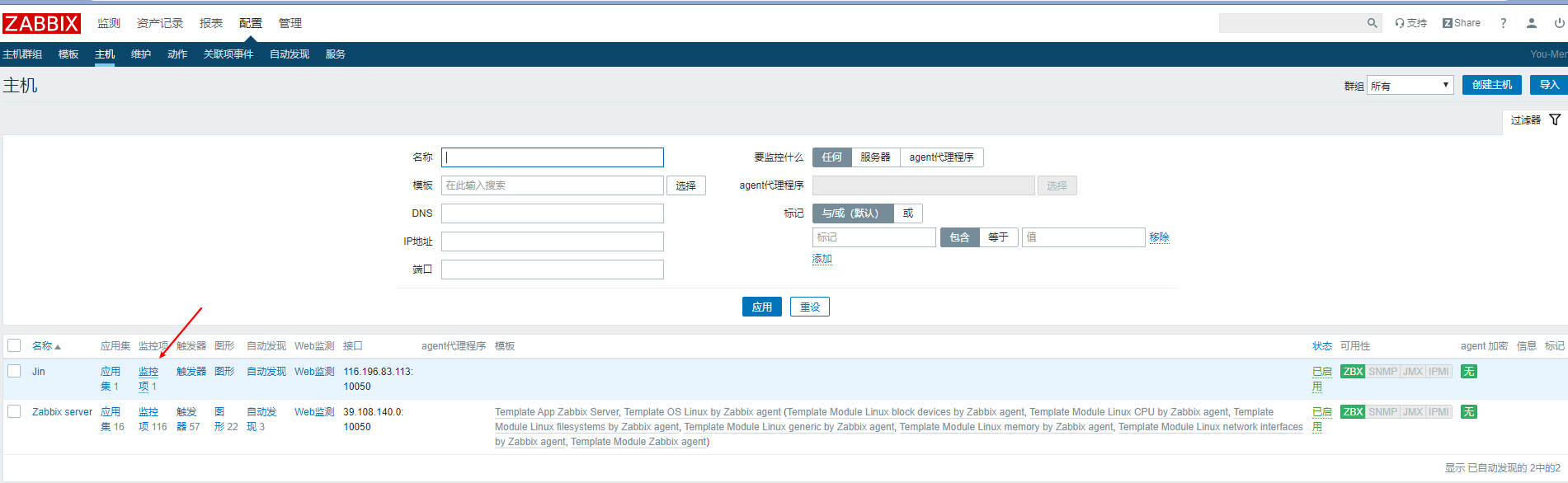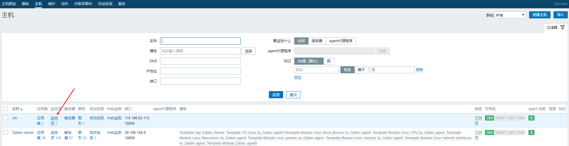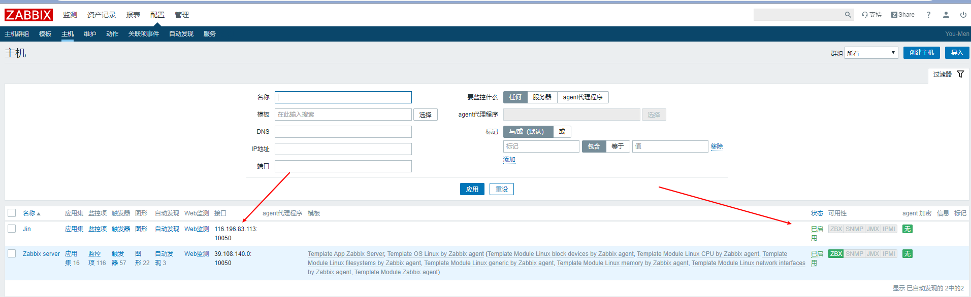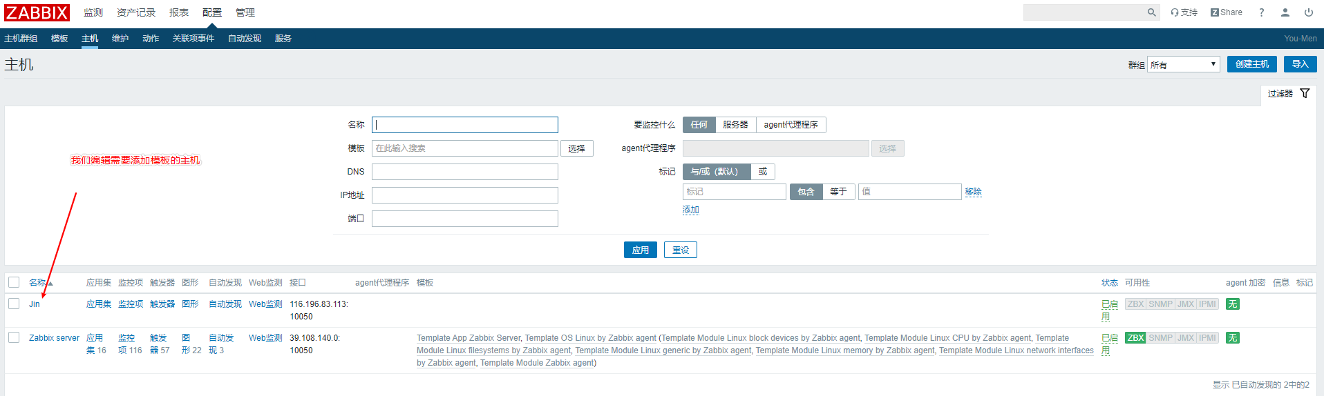 如果等上一段时间,可用性哪里没有红色警告,就说明这台主机被添加进来了,但是因为没有挂载模板和创建监控项,所以我们接下来尝试着挂载一下模板,然后再去创建监控项.