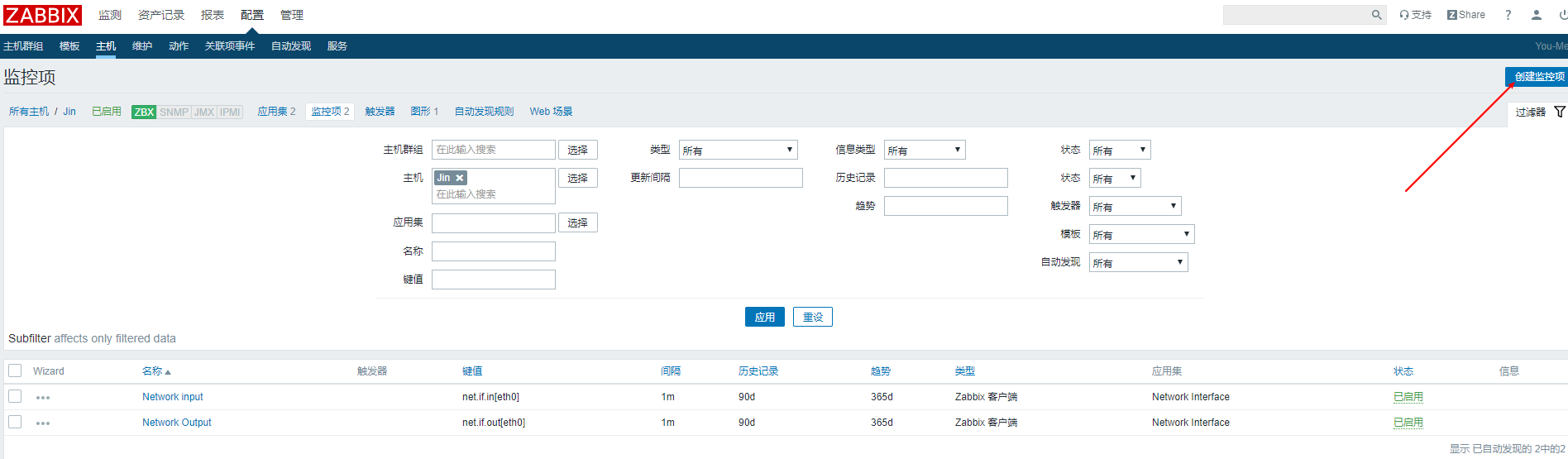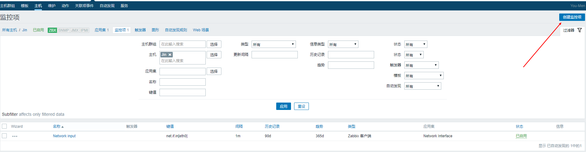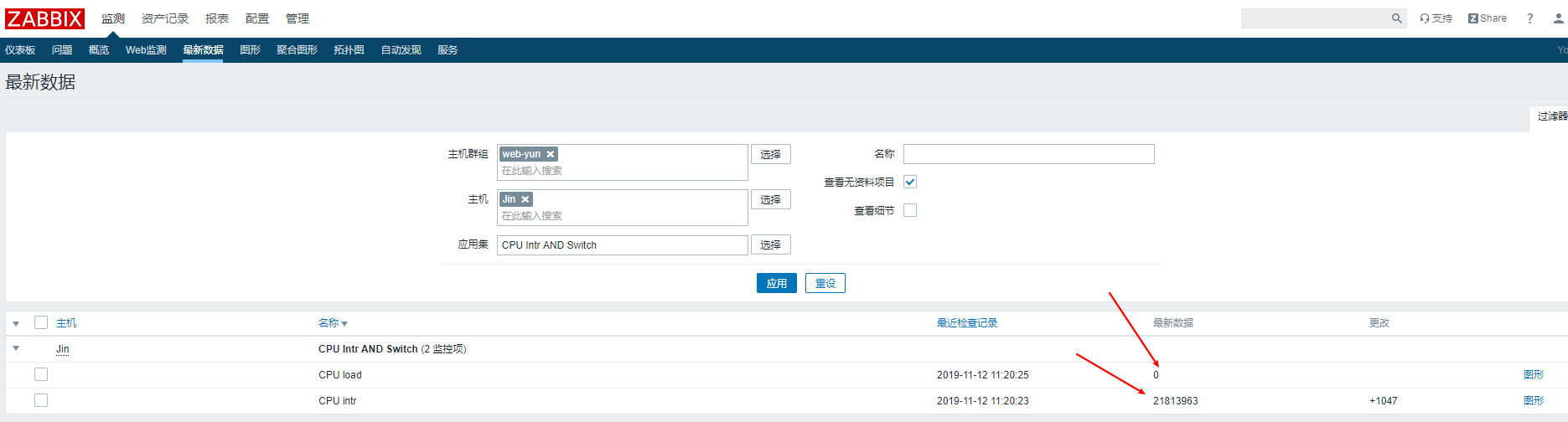 当一个监控项定义完成后,你可能好奇他具体获取了什么值,前往监控首页,点击最新数据,选择相应的主机.看数据能不能过来以及是不是自己想要的类型.