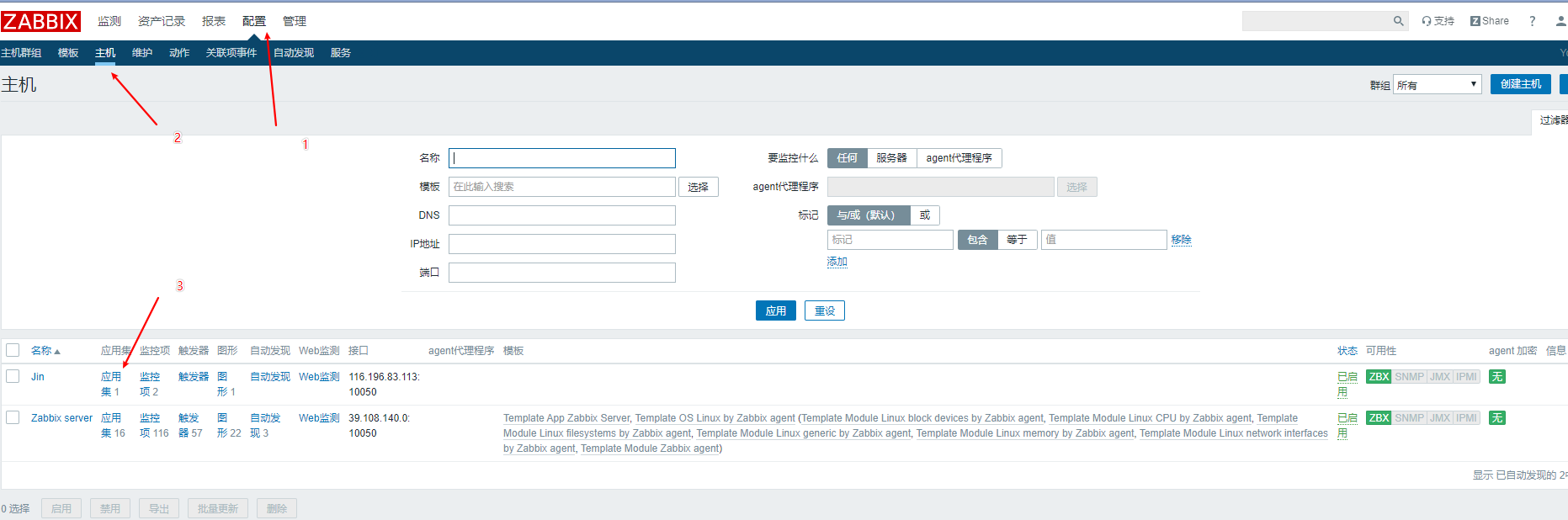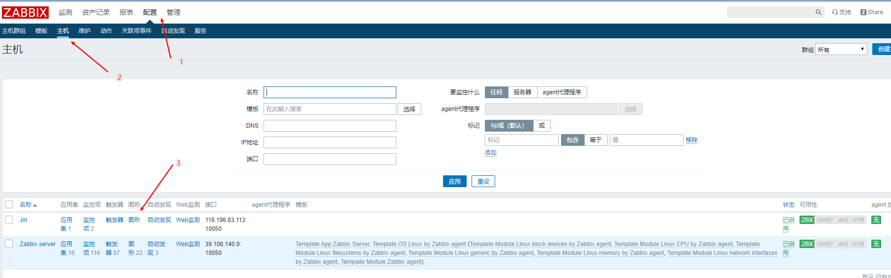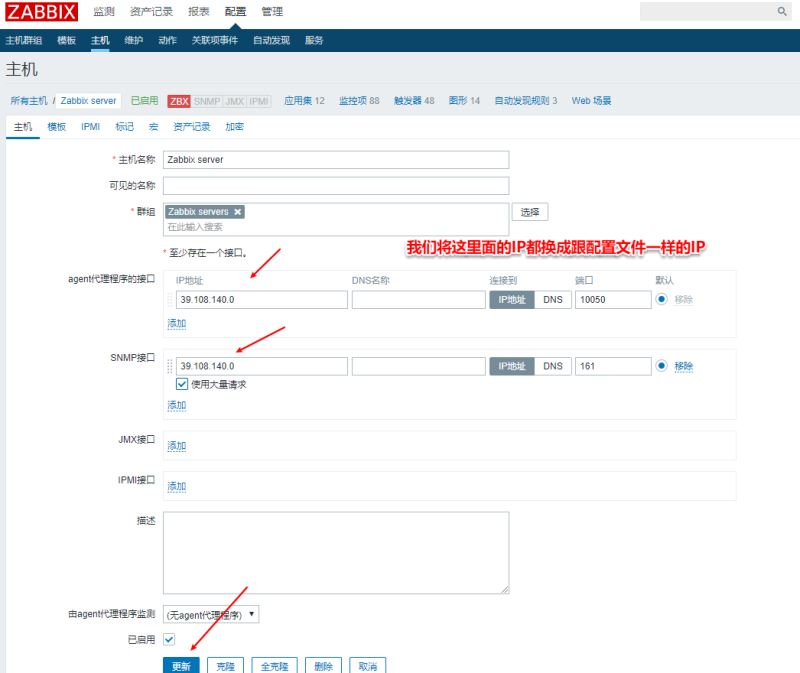 接下来我们到web界面上配置如何监控本地主机,我们看到接口上是127.0.0.1,但是我们配置文件写的是39.108.140.0,我们让这两个IP一致.点击3进去然后修改.
