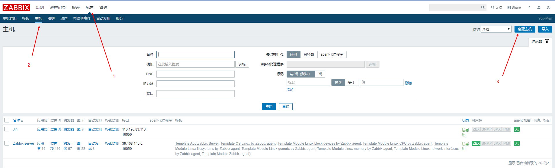 vim /etc/zabbix/zabbix_agentd.conf Server=39.108.140.0 # 被动模式 zabbix-server-ip ServerActive=39.108.140.0 # 主动模式 zabbix-server-ip Hostname=You-Men # Agent端主机名,最终显示在监控页面上的名字 UnsafeUserParameters=1 # 是否限制用户自定义keys使用特殊字符 systemctl restart zabbix-agent netstat -antp|grep agent tcp 0 0 0.0.0.0:10050 0.0.0.0:* LISTEN 3898/zabbix_agentd tcp6 0 0 :::10050 :::* LISTEN 3898/zabbix_agentd