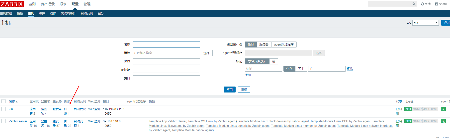 至此,添加本地主机,远程主机,创建主机组,挂载模板就已经完了