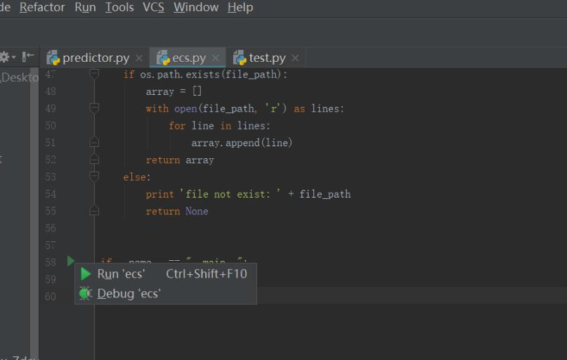 如上图,不要点击pycharm右上角的Debug,那样不能进入调试(在多个py文件都存在的情况下),找到程序的入口点出(if __name == "__main__),会有上图所示一个三角符号,点击后,出来上图两个选项,点击Debug'ecs'即可(ecs是我的.py文件名字),就进入愉快的单步调试界面啦