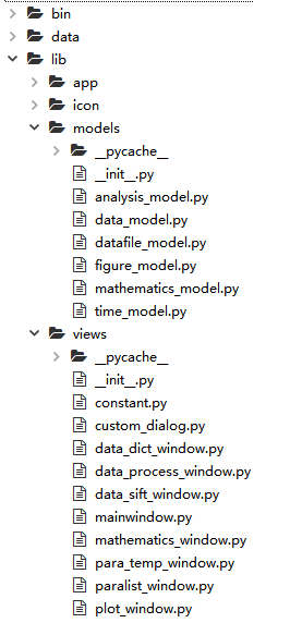 以图中项目为例,Python源代码文件在多个目录下:bin, lib\app, lib\models, lib\views;图标资源文件在lib\icon目录下;其它资源文件在data目录下,包括文本文件,视频文件等等。