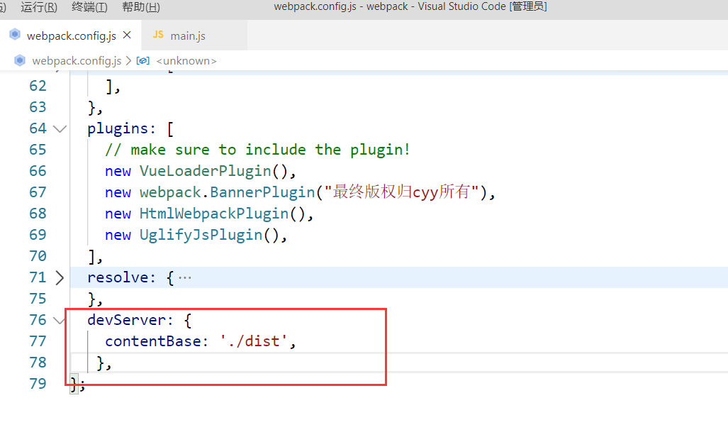 new webpack.BannerPlugin("最终版权归cyy所有"),