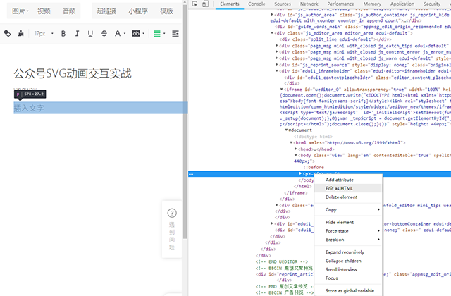 因为公众号图文编辑器本身并不支持代码编辑,我们需要借助chrome开发者工具,将代码插入到编辑器并保存。
