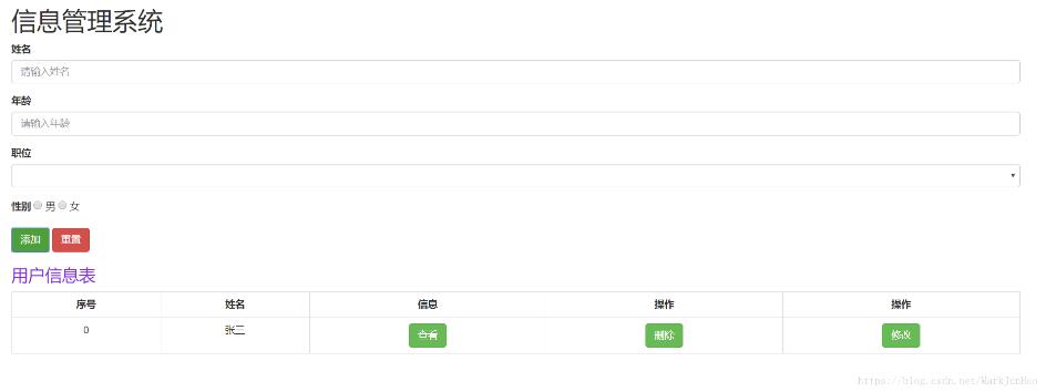 最近学习了vue,自己用bootstrap+vue写了一个信息管理系统,只有前端,没有后台,可以实现基本的增、删、改、查