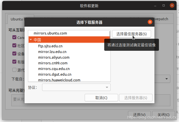 推荐选择 mirros.aliyun.com 或者 mirrors.tuna.tsinghua.edu.cn,你也可以点击选择最佳服务器,测试连接最快的软件源(测试时间较长)。