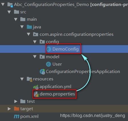 加载demo.properties文件中的信息绑定到bean,并注入容器示例: