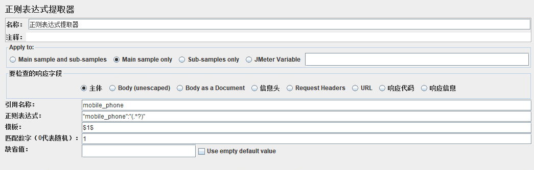缺省值:如果正则表达式没有匹配到数据,引用变量将会返回一个默认值,在调试中此功能很有用,如果没有设置默认值,那么很难分辨出正则表达式是否有匹配到数据或使用是否正确,当然你也可以根据你的测试需求,在调试完成后去掉默认值的设置