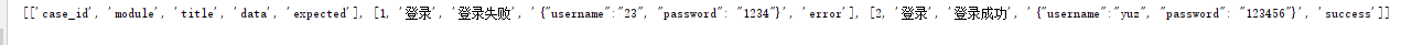#获取表单的最大行数 row_max=sheet.max_row #获取最大列数 cloumn_max=sheet.max_column #使用嵌套循环的方式,精准的拿到每一个坐标的对象,然后转化为值 row_data=[] for row in range(1,row_max+1): cloumn_data=[] for cloumn in range(1,cloumn_max+1): #print(sheet.cell(row,cloumn)) cloumn_data.append(sheet.cell(row,cloumn).value) row_data.append(cloumn_data) print(row_data) #运行结果: