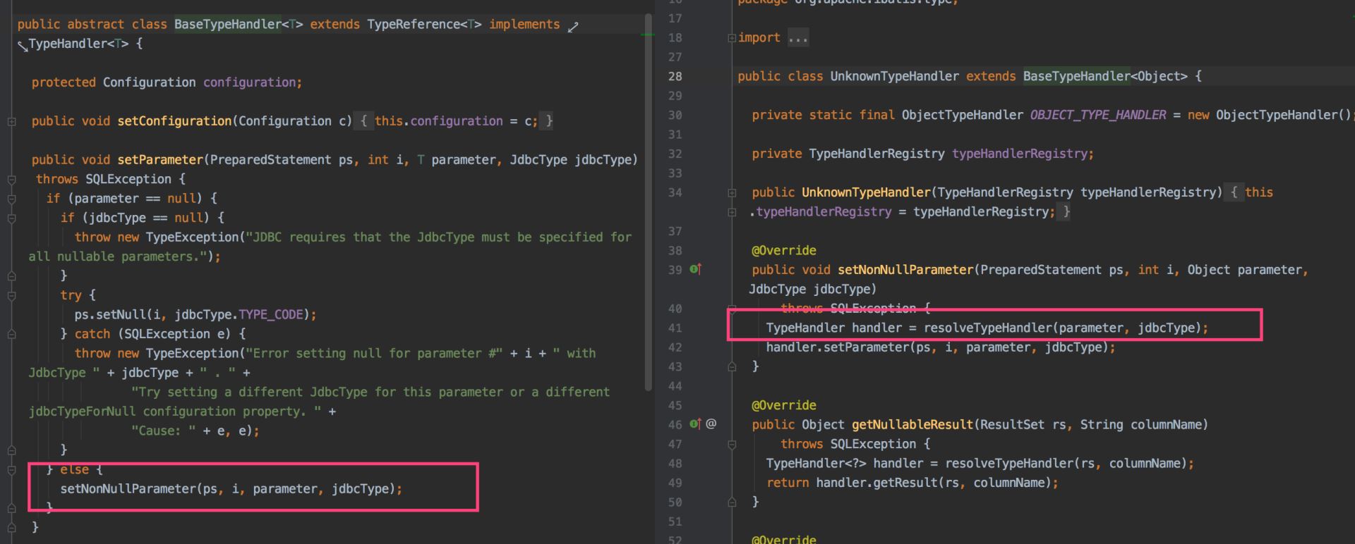 在typehandler的流程里,首先会进入BaseTypeHandler,然后在具体设置时,进入子类的方法,在UnknownTypeHandler,首先会再次对parameter进行解析,判断最正确的TypeHandler类型,如下图代码所示: