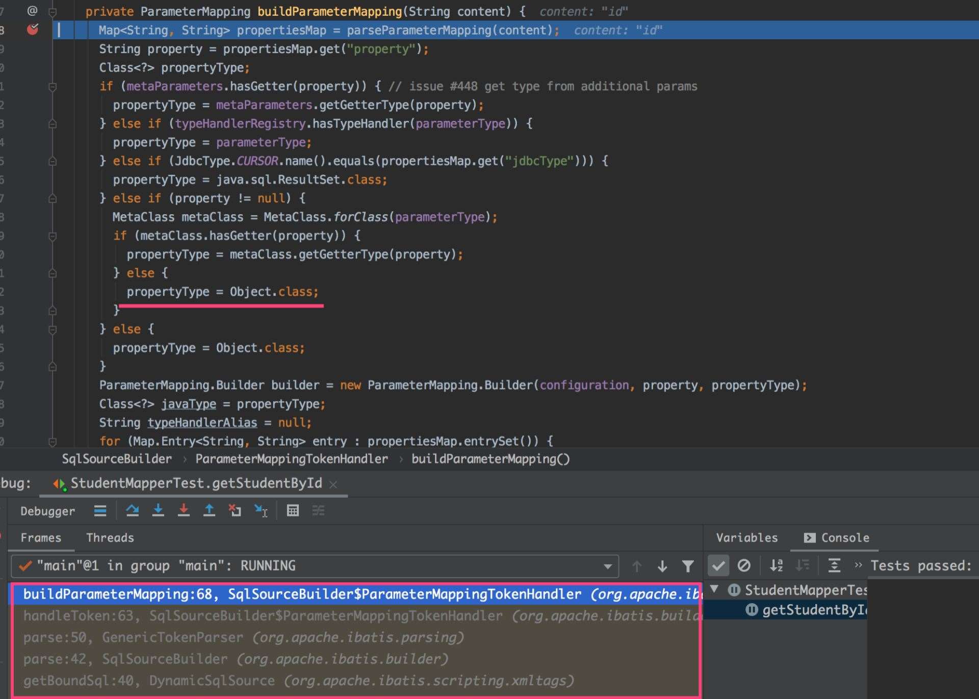 因为在框架初始化阶段,SqlSource中 parameterMapping, id对应的类型就是java.lang.String,导致在进行Sql语句替换时,获取到的TypeHandler是StringTypeHandler,如下图所示: