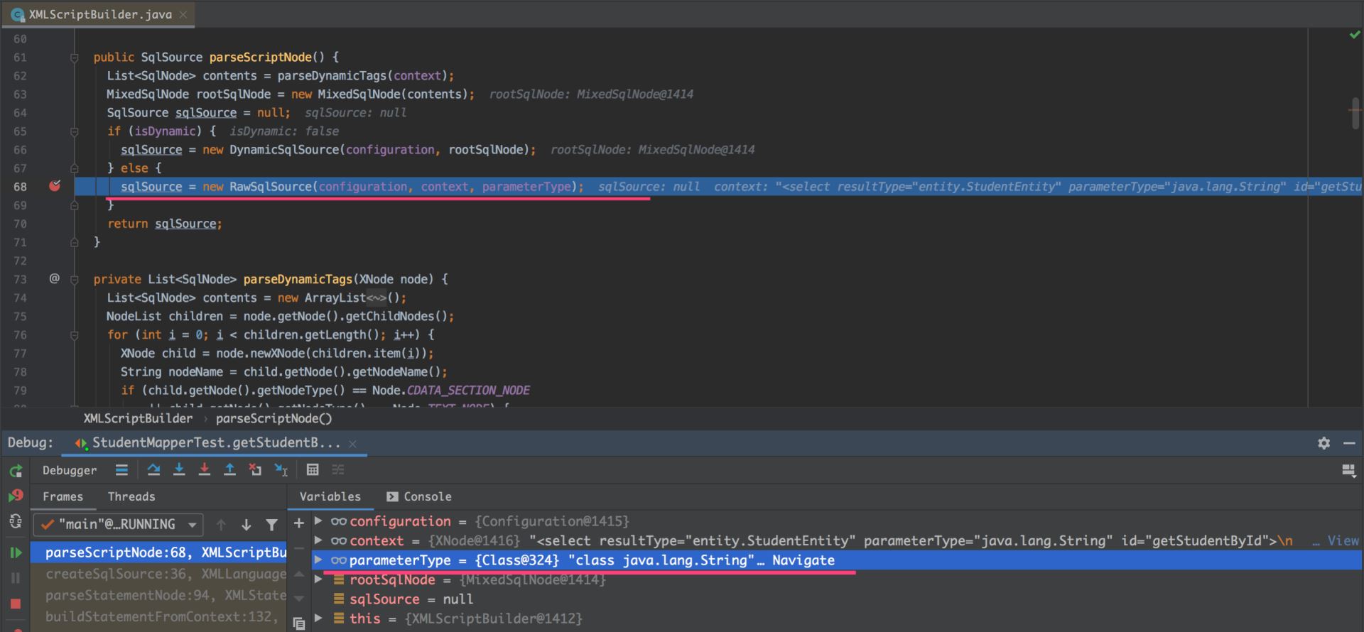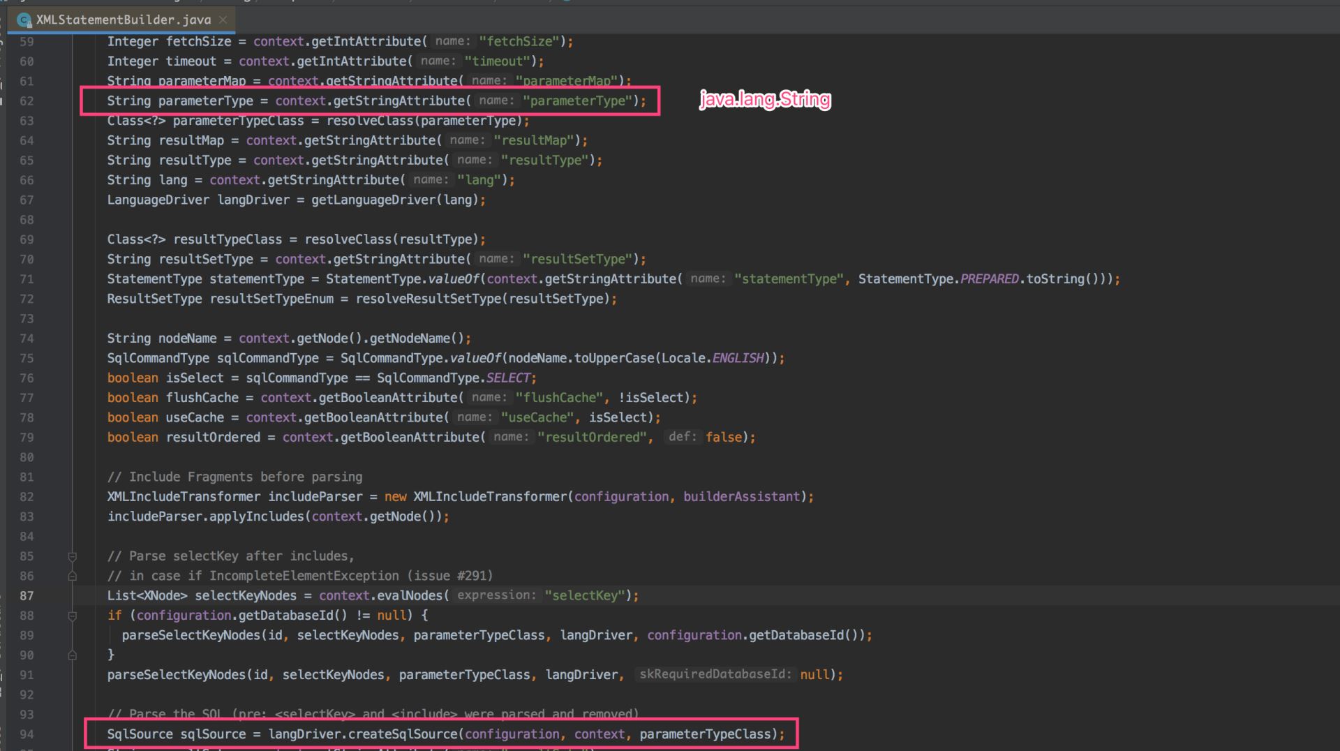 在构建Configuration的过程中,会涉及到构建对应每一条sql语句对应的MappedStatemnt,在parmeterTypeClass就是根据我们在xml配置中写的parmeterType转换而来,值为java.lang.String,在接下来构建SqlSource中,传入了这个参数,如下图所示: