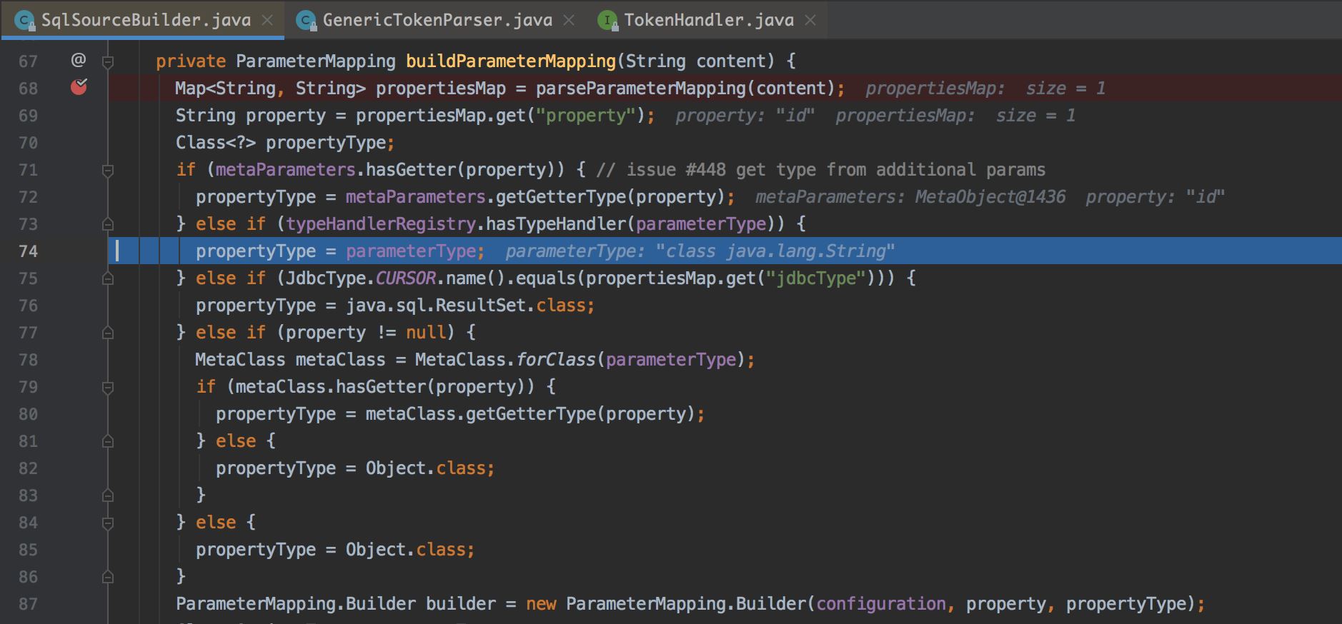 接下来,通过SqlSourceBuilder sqlSourceParser 对sql以及计算得到的类型进行再次处理,当中流程代码比较长,主要是在这个过程中去制作 sql方法的入参 和 java类型的绑定关系,mybatis依赖这个绑定关系使用对应的TypeHandler去进行值的转换,调用链路是SqlSourceParser.parse -> 内部类 ParameterMappingTokenHandler.handleToken -> 私有方法 buildParameterMapping, 如下图代码所示。因为当前的parmeterType为 MapperMethod$ParamMap,进过了多个if判断,判定当前property id 的 propertyType 为Object.class类型,接下来就是制作 sql方法的入参 和 java类型的绑定关系 parameterMapping,并进行了返回。