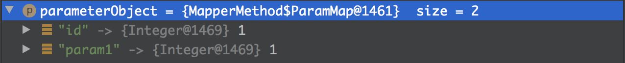 通过上图的代码可以得知,parameterType在初始化阶段未被使用,而是在SQL执行时,获取到的,但获取到的类型是parameterObject对应的类型,这个类是用来记录mapper方法上对应的参数的。如下图所示,并非在Sql配置文件中标注的java.lang.String。