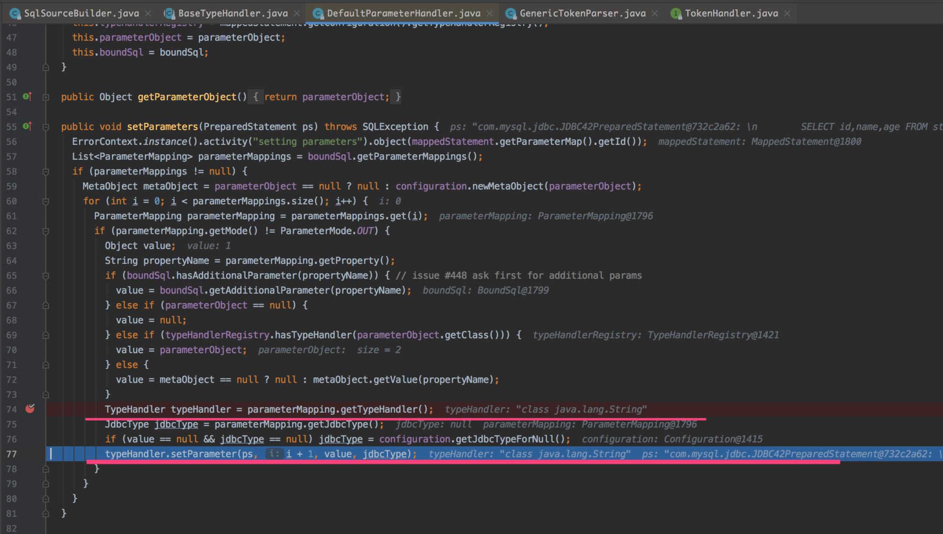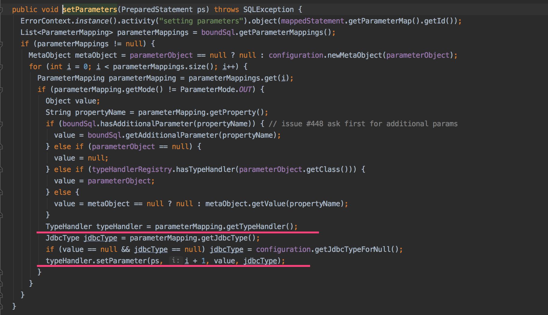在PreparseStatmentHandler进行参数化时,会将参数化的职责交给DefaultParameterHandler进行,如下图代码所示,主要关注红线部分,首先会获取parameterMapping对应的TypeHander,如上章节所示,获取到的是UnknownTypeHandler,然后会通过setParameter方法,将参数id替换成对应的值。