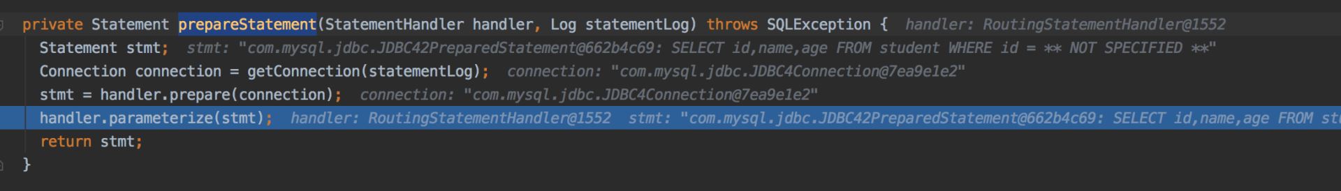 接下来流程就会流转到Executor, org.apache.ibatis.executor.SimpleExecutor#doQuery进行查询时,会根据当前的SQL类型,生成对应的statmentHandler,因为我们目前都是用的预编译SQL,因此生成的statementHandler就是PrepareStatmentHandler,熟悉JDBC的小伙伴应该马上可以猜到这对应的语句是什么类型了。接下来就会对这句SQL语句进行填充,如下图代码所示,会通过PrepareStatmentHandler的parameterize方法对Statment进行参数化,也就是进行填充过程。