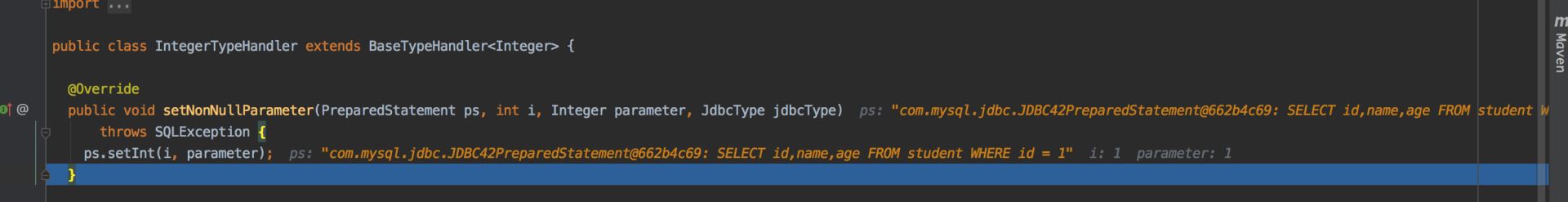 在获取到IntegerHandler后,就可以使用IntegerTypeHandler的setInt方法,对SQL语句中的参数进行替换,如下图代码所示,sql语句被成功替换。