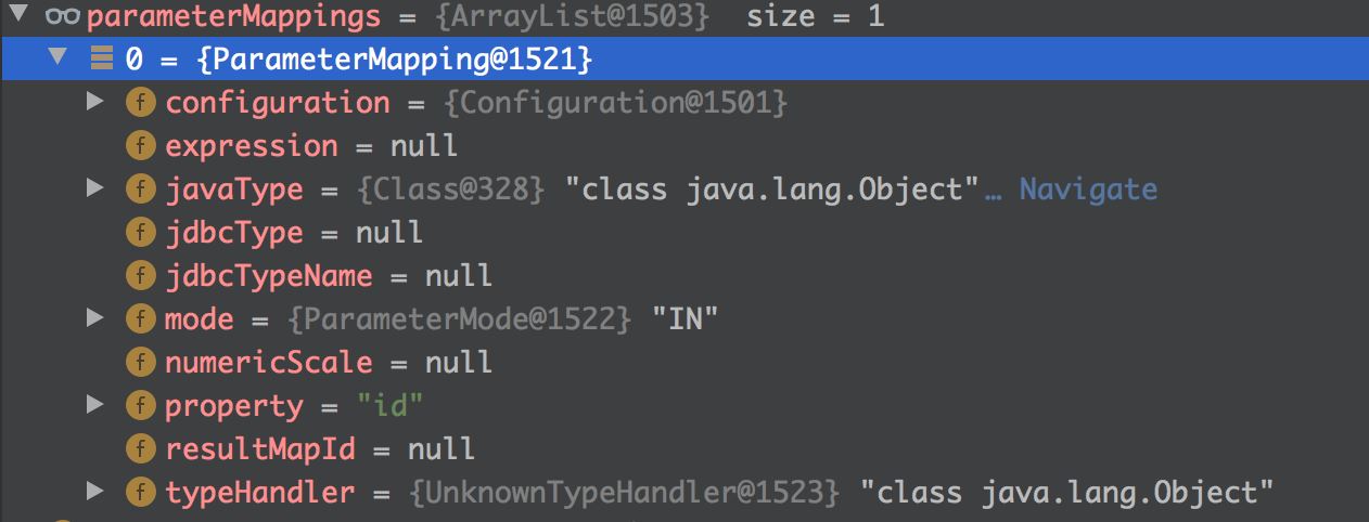 制作完成的ParameterMapping的结构如下图代码所示,参数id对应的javaType类型为 java.lang.Object,对应的TypeHander处理器为UnknownTypeHandler,也就是未找到合适的TypeHandler的兜底选项。