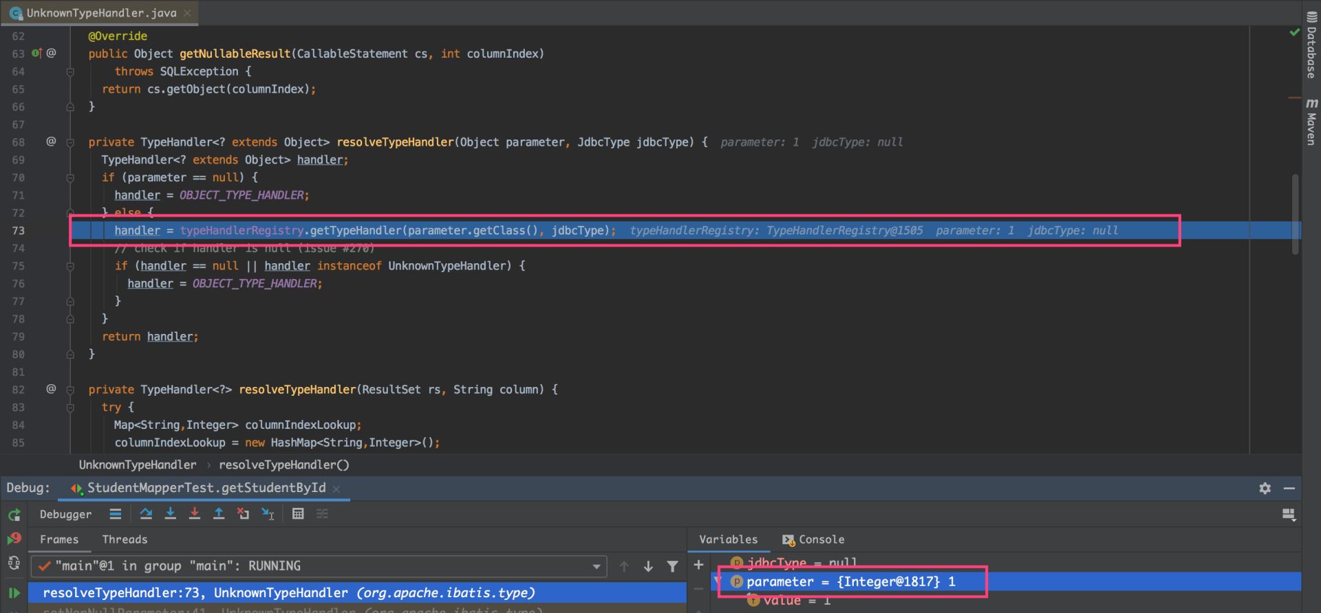 在resolveTypeHandler方法中,因为已知参数值的类型,通过Integer这个class在typeHandlerRegistry中寻找对应的TypeHandler,TypeHandlerRegistry是Mybatis启动时内置好的,java对象类型和TypeHandler的映射关系,有兴趣的可以进这个类详细看下,在本案例中,会直接获取到IntegerHandler,如下图代码所示:
