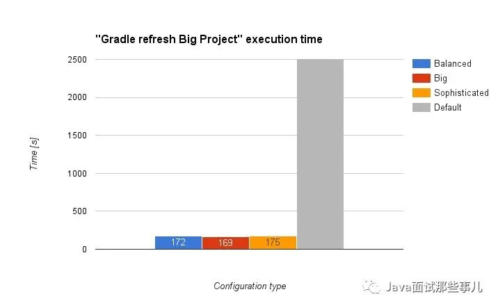 重要提示:代表默认设置的灰色条形柱非常高,因为 IDEA 在刷新过程中崩溃了,笔者无法测量实际时间。显然,默认分配的内存不足以执行该操作。
