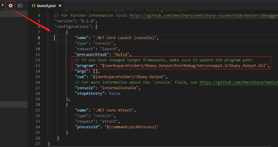 如果开始测试后,警告提示启动程序找不到,可以按提示(也可以点击界面齿轮按钮)修改配置文件 .vscode/launch.json