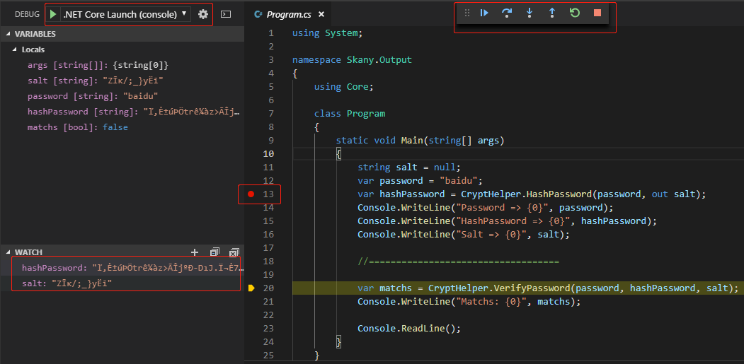 在 Output/Program.cs 中第13行设置一个端点(鼠标在行首点一下即可,再点一下移除断点)