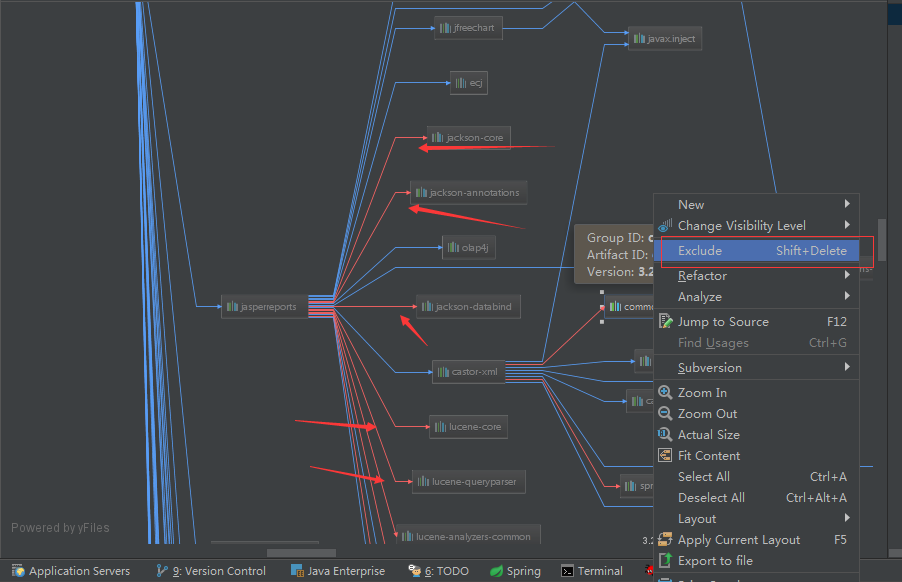 图中的红色实线就算是冲突的,可以入上图那样,右键,排除,他就自动在pom文件里面给exclud啦。