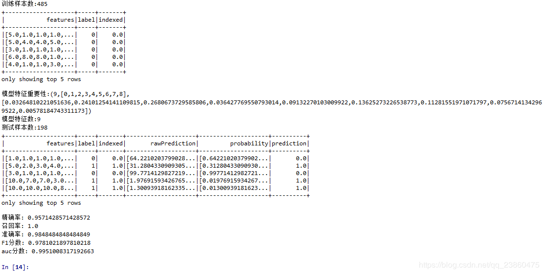 from pyspark import SparkConf from pyspark.sql import SparkSession from pyspark.ml.linalg import Vectors from pyspark.ml.feature import StringIndexer from pyspark.ml.classification import RandomForestClassifier from pyspark.sql import Row import pandas as pd from sklearn import metrics if __name__ == "__main__": appname = "RandomForestClassifier" master ="local[4]" conf = SparkConf().setAppName(appname).setMaster(master) #spark配置 spark=SparkSession.builder.config(conf=conf).getOrCreate()#spark实例化 #读取数据 data=spark.read.csv('良恶性乳腺癌数据.csv',header=True) #构造训练数据集 dataSet = data.na.fill('0').rdd.map(list)#用0填充空值 trainData, testData= dataSet.randomSplit([0.7, 0.3], seed=7) trainingSet = trainData.map(lambda x:Row(label=x[-1], features=Vectors.dense(x[:-1]))).toDF() train_num = trainingSet.count() print("训练样本数:{}".format(train_num)) #使用随机森林进行训练 stringIndexer = StringIndexer(inputCol="label", outputCol="indexed") si_model = stringIndexer.fit(trainingSet) train_tf = si_model.transform(trainingSet) train_tf.show(5) rf = RandomForestClassifier(numTrees=100, labelCol="indexed", seed=7) rfModel = rf.fit(train_tf) #输出模型特征重要性、子树权重 print("模型特征重要性:{}".format(rfModel.featureImportances)) print("模型特征数:{}".format(rfModel.numFeatures)) #预测测试集 testSet = testData.map(lambda x:Row(label=x[-1], features=Vectors.dense(x[:-1]))).toDF() test_num=testSet.count() print("测试样本数:{}".format(test_num)) si_model = stringIndexer.fit(testSet) test_tf = si_model.transform(testSet) predictResult = rfModel.transform(test_tf) predictResult.show(5) spark.stop() #将预测结果转为python中的dataframe columns=predictResult.columns#提取强表字段 predictResult=predictResult.take(test_num)# predictResult=pd.DataFrame(predictResult,columns=columns)#转为python中的dataframe #性能评估 y=list(predictResult['indexed']) y_pred=list(predictResult['prediction']) y_predprob=[x[1] for x in list(predictResult['probability'])] precision_score=metrics.precision_score(y, y_pred)#精确率 recall_score=metrics.recall_score(y, y_pred)#召回率 accuracy_score=metrics.accuracy_score(y, y_pred)#准确率 f1_score=metrics.f1_score(y, y_pred)#F1分数 auc_score=metrics.roc_auc_score(y, y_predprob)#auc分数 print("精确率:",precision_score )#精确率 print("召回率:",recall_score )#召回率 print("准确率:",accuracy_score )#准确率 print("F1分数:", f1_score)#F1分数 print("auc分数:",auc_score )#auc分数