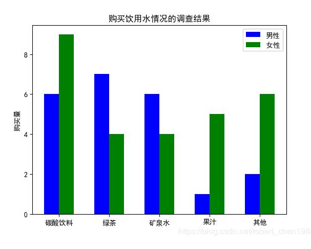 plt.xticks(index_male + bar_width/2, waters) # 让横坐标轴刻度显示 waters 里的饮用水, index_male + bar_width/2 为横坐标轴刻度的位置