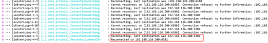 手动shutdown redis的master服务后,后台会尝试重连,当超过最大等待时间,无法连接后,sentinel会重新选举出一个新的master,程序获取到新的master节点,提供读写服务