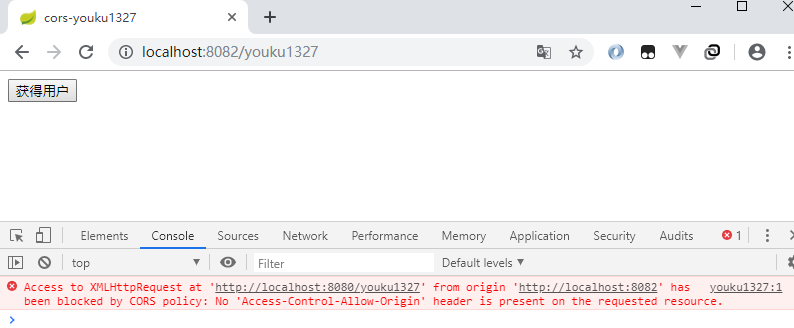 <!DOCTYPE html> <html lang="en" xmlns:th="http://www.thymeleaf.org"> <head> <meta charset="UTF-8"> <title>cors-youku1327</title> </head> <body> <script th:src="@{jquery-1.8.3.js}" type="text/javascript"></script> <button id="button">获得用户</button> <script> $("#button").click(function () { $.ajax({ url: "http://localhost:8080/youku1327", type: "get", success:function (result) { console.log(result); } }) }); </script> </body> </html>