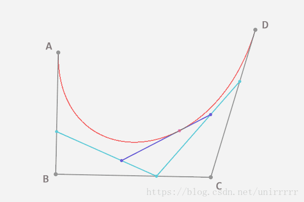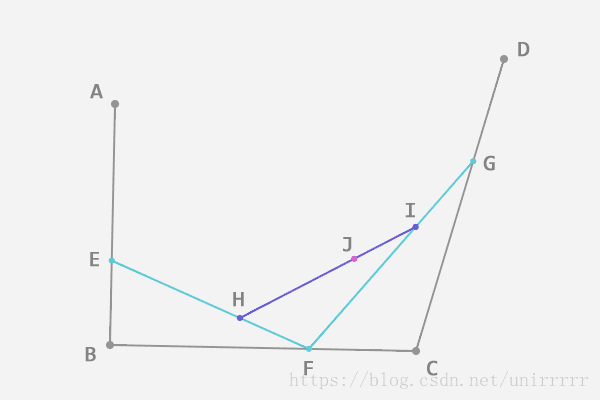 如下图,t = AE:AB = BF:BC = CG:CD = EH:EF = FI:FG = HJ:HI,J即为Bezier曲线上的点